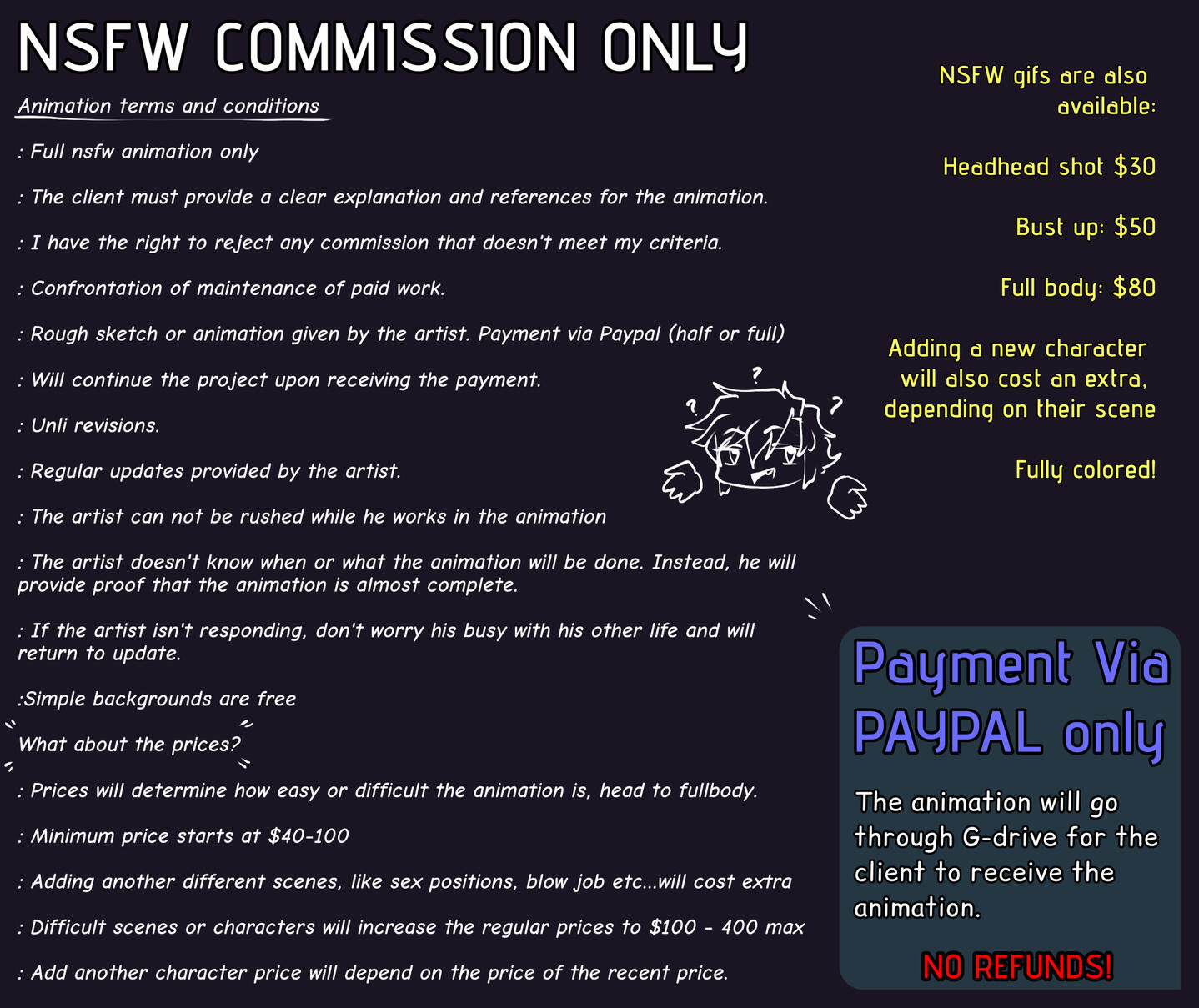 Yes, my art commission prices often differ based on the level of detail and the scope of the work. Your rates make sense for every complexity:Head ($20): Simplest, just the face or head area.Bust Up ($25): Includes head, shoulders, and maybe a bit of the chest.Half Body ($35): Adds more detail, including the torso and sometimes hands.Full Body ($55): Most detailed, covering the entire figure, including full poses, clothing, and accessories.These prices reflect the amount of work and detail involved.Adding new characters still depends on the prices that are given above.Add background: $10-20 depends with the complexity of the given background.For nsfw: add $20